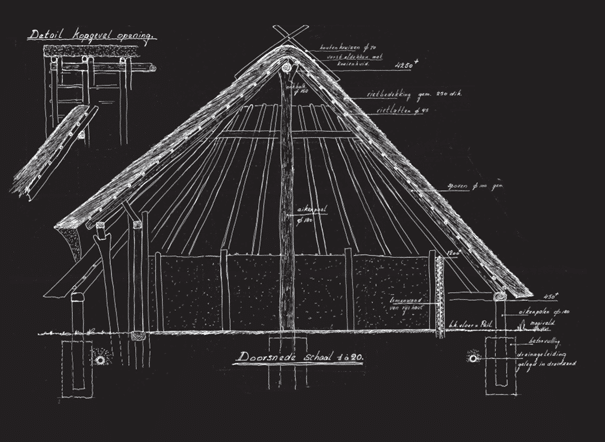 • De bouwtekening toont de huizen in de IJzertijd tweeschepig waren. De ruggengraat werd gevormd door een rij zware, houten palen waarop een schilddak rustte. Het dak werd aan de buitenkant ondersteund door palen; de lemen wanden stonden vrij.