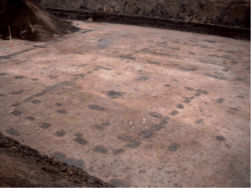 • De opbouw van de boerderij is gebaseerd op opgraafgegevens. Op deze archeologische foto zijn verkleuringen in de grond te zien. Dit zijn de restanten van houten palen. De plattegrond is ongeveer 18 meter lang en 8 meter breed.
