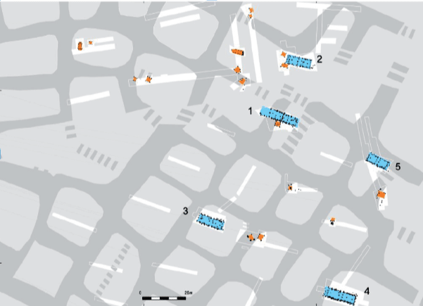 • Op deze kaart zijn langs de Vijfsprongweg in 1939-1941 opgegraven gebouwrestanten zichtbaar, te midden van het rasterpatroon van de Celtic Fields. Nu weten we dat er enkelen boerderijen lagen met de kopse kant in de wind.