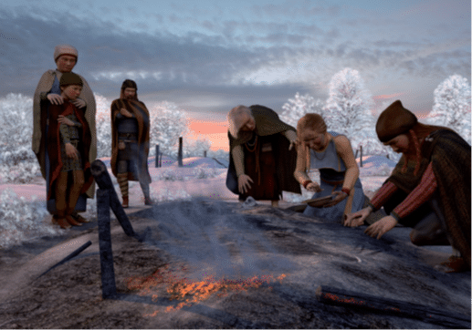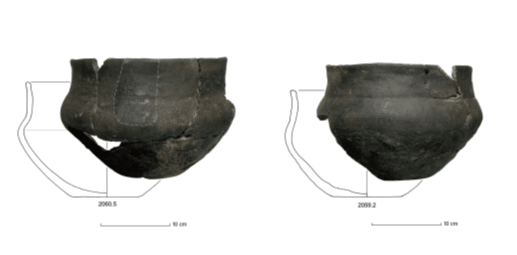 • In de boerderijen vinden archeologen voornamelijk scherven van met de hand gemaakt aardewerk. De vorm, de versiering en het soort klei zegt iets over de herkomst en ouderdom van het materiaal.